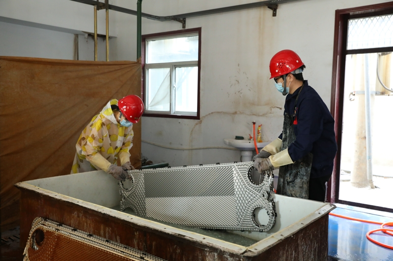 在交警支隊站,馬福森查看了板換清洗工作,并向二公司負責人了解設備維保、收費經營等情況,他對二公司打破崗位職責約束,對中層管理人員合理分工安排,對運行管理員、用戶管理員統籌調配,全力推進設備維保的做法予以肯定。他叮囑分公司工作人員,在分配工作任務時要本著人性化的原則,把時間調整開,盡量避開高溫時段。馬福森現場要求后勤負責人為一線員工購置電風扇,為室內板換清洗、閥門保養等工作創造相對舒適的工作環境;并要求總工程師辦公室及相關責任部門要盡快推進生產服務綜合體項目,爭取早日投產達效,應用先進的清洗設備開展板換清洗工作,降低員工工作強度。